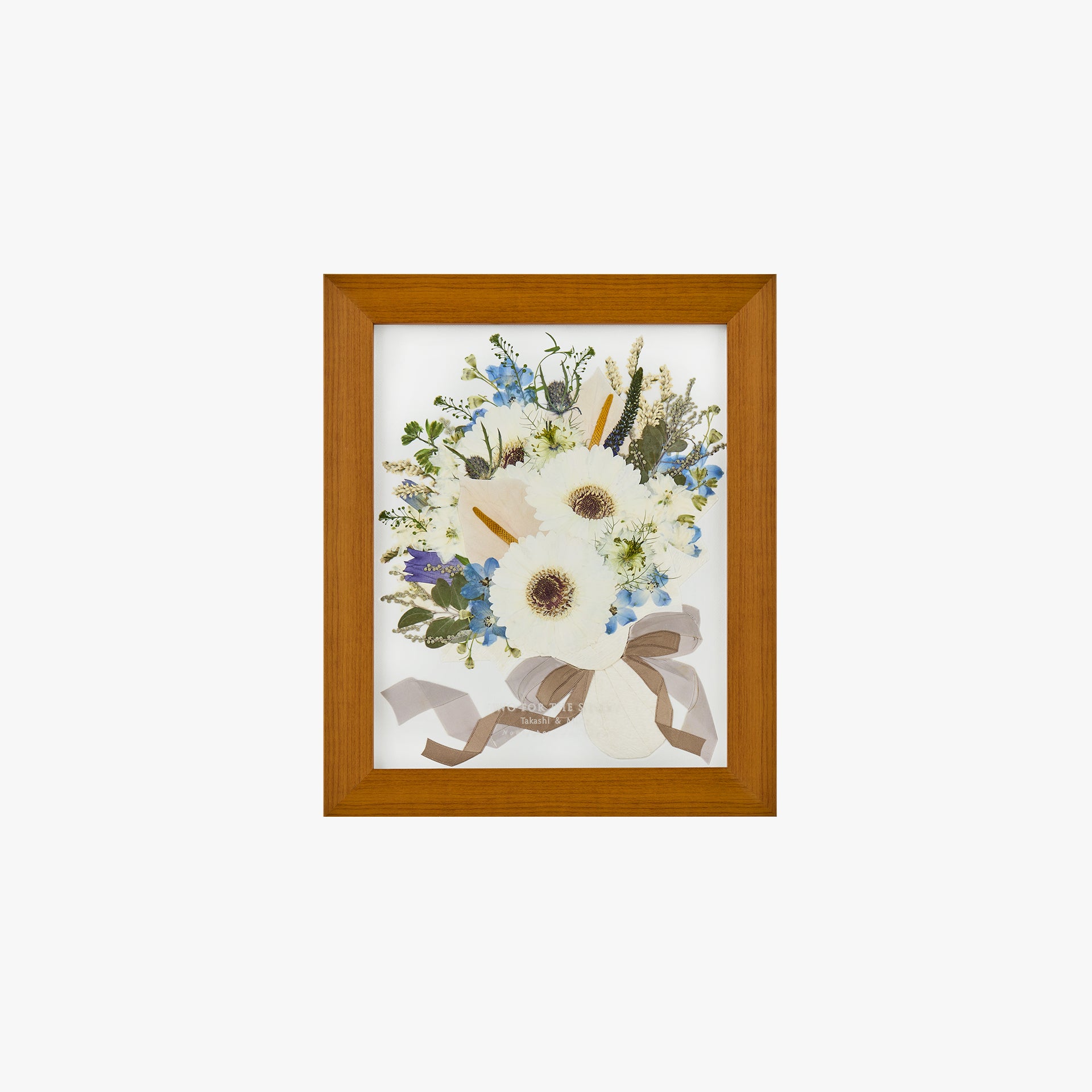 アフターブーケはお客様のお花を元に額のサイズに適した綺麗に見える本数でレイアウトをいたします。