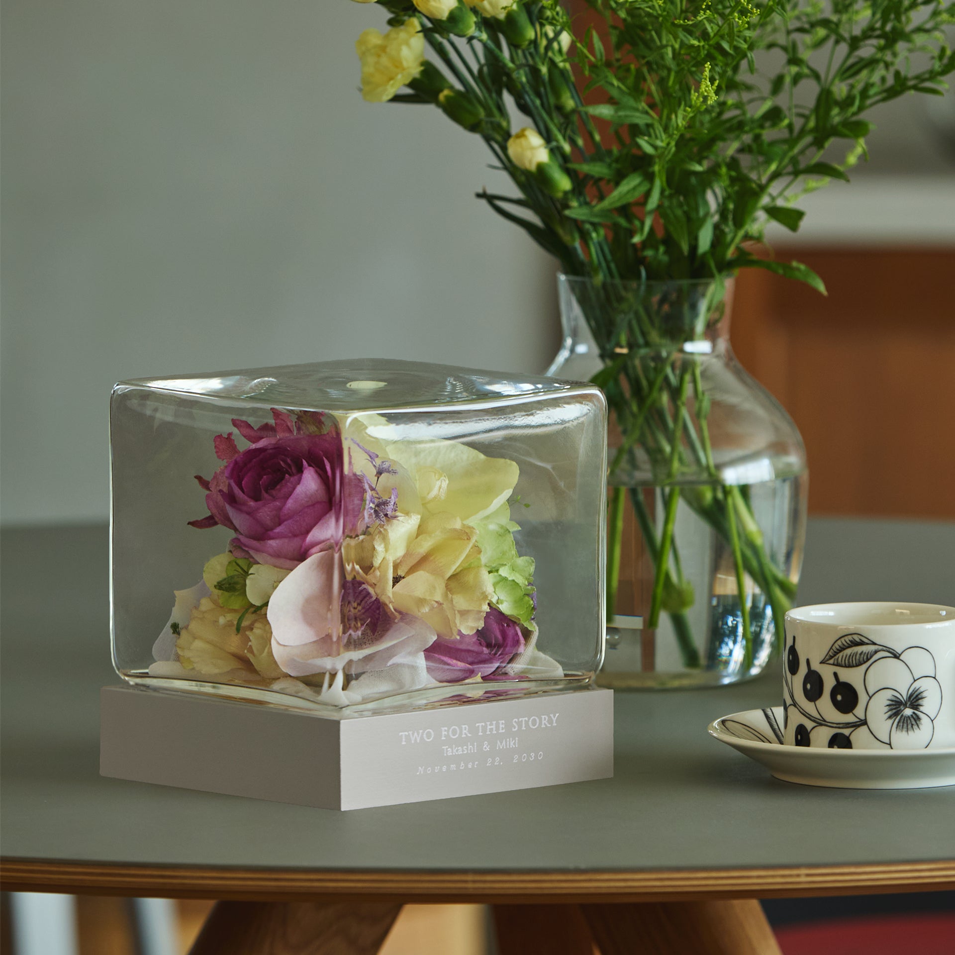 どの角度からも花々の表情を楽しめる、存在感のある全面ガラスタイプ。手吹きガラスの微細なゆらぎが、余白を活かした佇まいに。